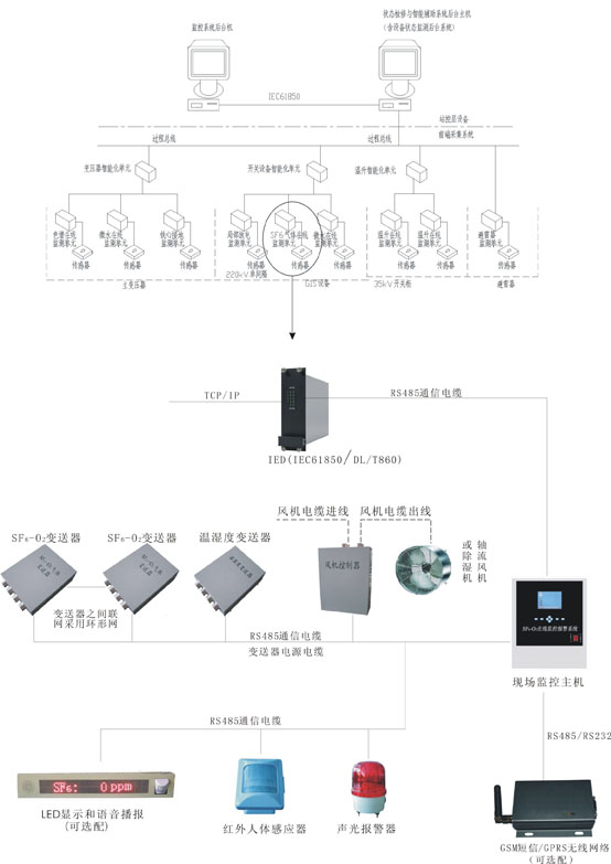 3、产品特点 ●多重检测功能:主要针对SF6气体泄漏和缺氧状况进行检测,并兼有温度、湿度等环境数据的辅助检测功能,完全符合《电业安全工作规程》要求。 ●先进的气体传感器:低浓度SF6气体检测技术,报警误差<5%,氧气报警误差<0.5%。 ●早期现场报警技术:微量监测技术能发出早期现场警报,并指示气体泄漏位置,及时通知危险地点内人员疏散,寻找及消除泄漏源,保护运行设备。 ●现场总线设计:一根电缆连接所有变送器及主机,可分立可组合,具有很高的现场适应性。 ●多点组网检测:最多128点同时检测,满足现场环境需要,提高检测可靠性。 ●遥测遥信能力:数据可传送到远方控制中心,控制中心也可直接远程查询、控制监控系统。 ●短信提醒功能:报警信息可通过短信息发送到预先设置的多个手机号码 ●长寿型设计:充分利用单片机的工作灵活性,传感器采取间歇式工作测量,大大提高了传感器的工作稳定性和使用寿命。 ●历史数据记录和查询:大容量数据存储器,可直接在监控主机上进行快捷查询。 ●自动语音提示、报警:自动语音提示实时检测结果,加强现场工作人员的直观感觉。 4、 SF6气体泄漏监控报警系统标准配置表