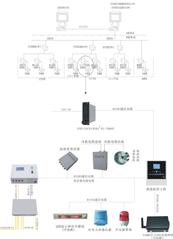 功能与参数: SF6检测范围:0~1500ppm,精度不低于50ppm 分辨率:1ppm O2检测范围:0~21.0% 误差:<0.5% 分辨率:0.1% 温度检测范围:-30~+100℃ 精度:0.5℃ 相对湿度检测范围:0~100%RH 精度:1% 工作电源:185~250VAC,防浪涌和雷击功能;自动加强跟踪可疑测量点功能,有效防止误报。 支持现场显示:大屏幕中文显示 (3)主机及辅助功能模块 功能与参数: 主机多种形式:壁挂式、3U 19英寸标准机箱、触摸屏落地POS机式; 支持RTU遥测遥信功能,远程启动风机功能; 多种风机启动模块:定时启动、报警启动、有人时自动启动、远程启动、手动启动等; 超大彩色液晶显示屏幕,仿真Windows界面,界面友好。 报警参数用户可设置。 支持报警数据海量存储,自动更新。 支持报警语音功能、报警指示灯或报警显示屏。 5、系统原理图