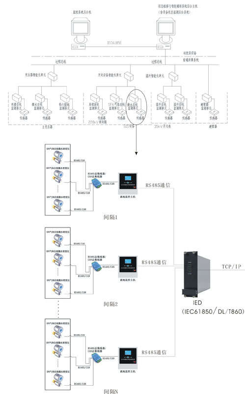 1、功能概述 MTZX-801M型SF6气体在线微水密度监测装置属于智能电网在线监测产品,主要用于在线监测SF6电气设备中气体的微水、密度、温度及其变化趋势。当SF6气体有关指标出现变化时,给出变化曲线;有关指标达到报警状态时,报警或自动启动报警装置;当有关指标超标达到危险状况时,报警或自动启动闭锁装置,禁止断路器动作,以保障设备和变电站整套系统的安全。 上述监测设备配有RS485/CAN通讯接口,可将监测数据实时上传至变电站、城市中心乃至更上级监控中心,真正实现变电站,尤其是无人值班站的设备在线监测。并为断路器的状态检修提供了有效依据。 2、主要特点 A、在线监测SF6气体湿度、密度与温度 B、预留RS485/CAN总线通讯接口 C、可按预设值或用户给定值自动启动低压报警、微水超标报警和闭锁装置 D、通过后台软件显示实时数据并自动绘制状态变化趋势图 E、大屏幕液晶显示器现场显示实时数据。具备液晶屏屏幕保护功能 F、手持遥控器设置底层各项技术参数、报警与闭锁门限值和显示方式 G、全密封,抗干扰,适用于室外和低温环境 3、技术指标 1、湿度指标 测量范围 -80~+20℃(或10~20000ppmv) 测量精度 0.1℃或1uL/L 报警门限 300~600uL/L (可根据客户要求设定) 2、密度指标 测量范围 0~1.00 MPa 精度等级 0.1级 分辨率 0.0001 MPa 额定压力 0.60 MPa或根据密度继电器设定 报警门限 0.50 MPa 或根据密度继电器设定 报警解除 0.51 MPa或根据密度继电器设定 闭锁门限 0.45 MPa或根据密度继电器设定 闭锁解除 0.46 MPa或根据密度继电器设定 3、温度指标 测量范围 -35~ +75℃ 测量精度 ±1℃ 报警门限 可选 4、其它指标、功能 显示方式 LCD中英文显示(128*64点阵) 通讯接口 RS485/CAN 各继电器接点容量 5A/250VAC,5A/30VDC 电源电压 AC220V ± 10% 波特率 2400bps 仪表尺寸 110×120×200(MM¬3) 管道接口尺寸 110×220×200(MM3) 5、环境要求 工作温度 -35 ℃~+60 ℃ 存储温度 -45 ℃~+80 ℃ 环境湿度 0~99%RH(无结露) 工作压力 0~1.0MPa 现场条件 户内或户外 4、智能IED连接方式(IEC-61850通信)